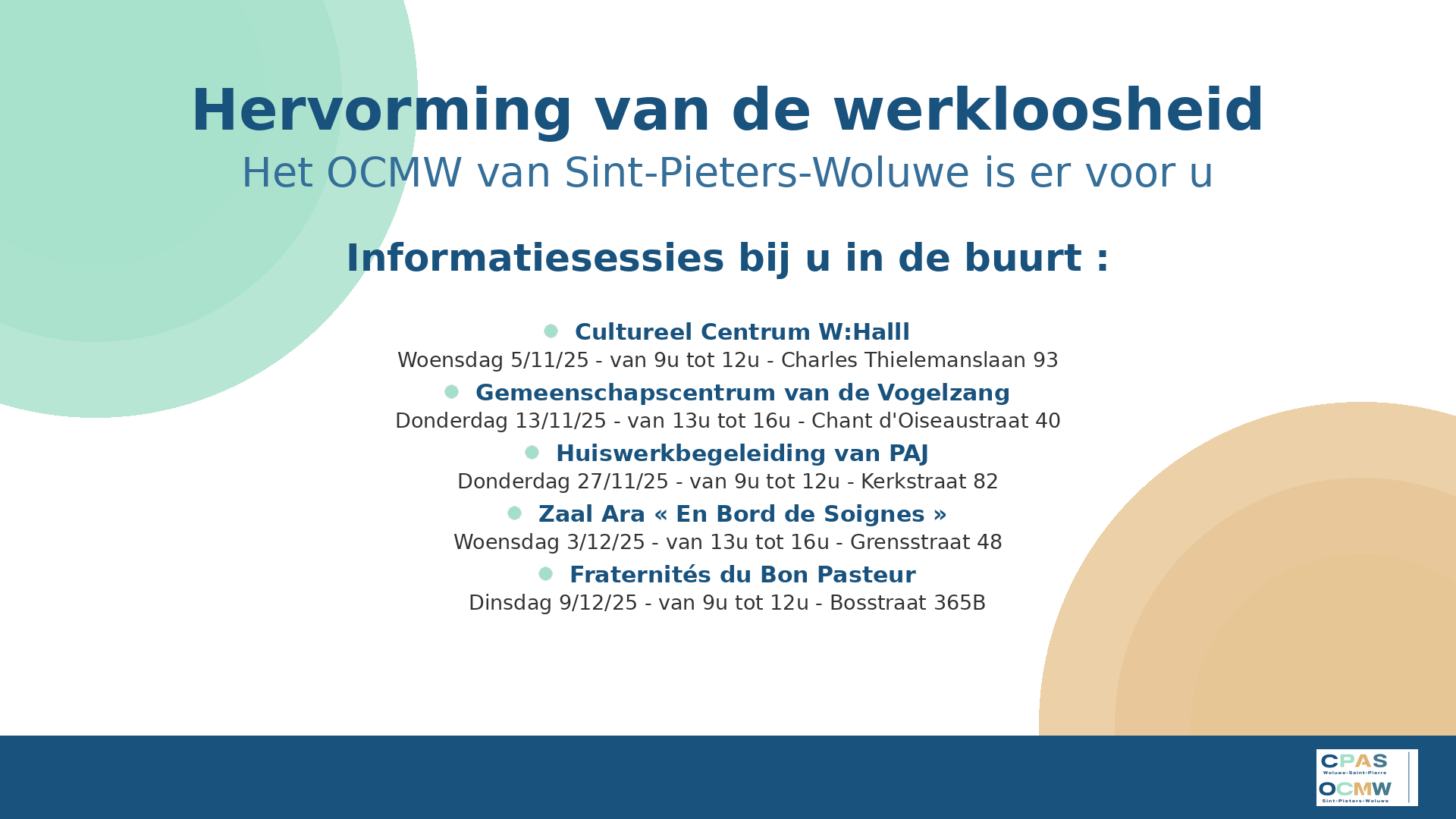 Om u zo goed mogelijk te informeren en te begeleiden, organiseert het OCMW van Sint-Pieters-Woluwe informatiesessies in de verschillende wijken van de gemeente :