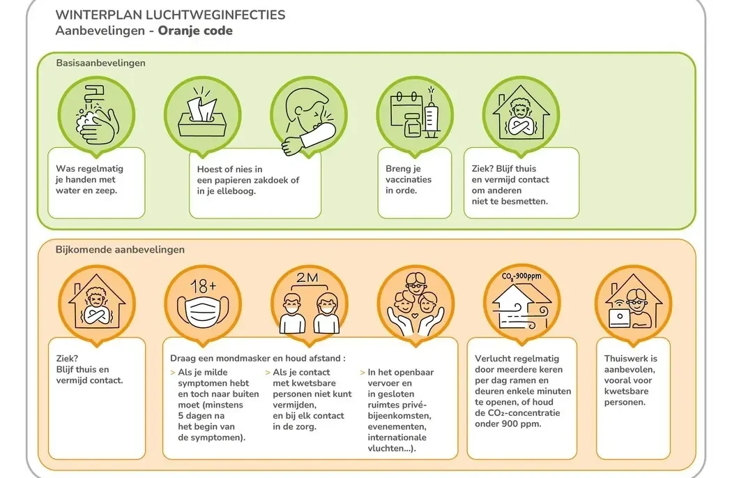 Door de basisaanbevelingen die heel het jaar van toepassing zijn, zo goed mogelijk op te volgen beperken we samen het risico op code rood en voorkomen we overbelasting van ons zorgsysteem: